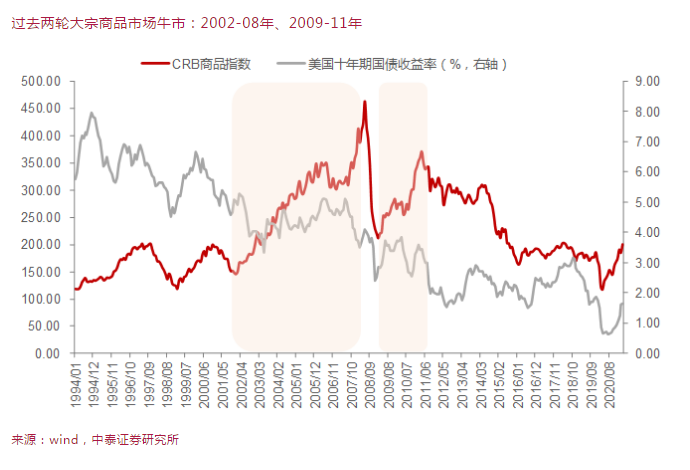 从历史规律来看,大宗商品牛市往往出现在:全球经济增速仍处在上升通道或者全球出现经济体对大宗商品具有强烈消费诉求。比如,1)2002年1月至2008年6月,全球经济处于上升通道,中国在加入WTO后经济腾飞,快速的工业化、城镇化极大地增加了对上游资源品的需求,引发大宗商品一轮牛市;2)2009年6月至2011年6月,全球金融危机后,中国在 “4万亿刺激”下掀起的房地产、基建的建设热潮对上游原材料的强力支撑,引发了又一轮大宗商品牛市行情,最后以OPEC大幅增产下油价的大幅下跌而结束。
