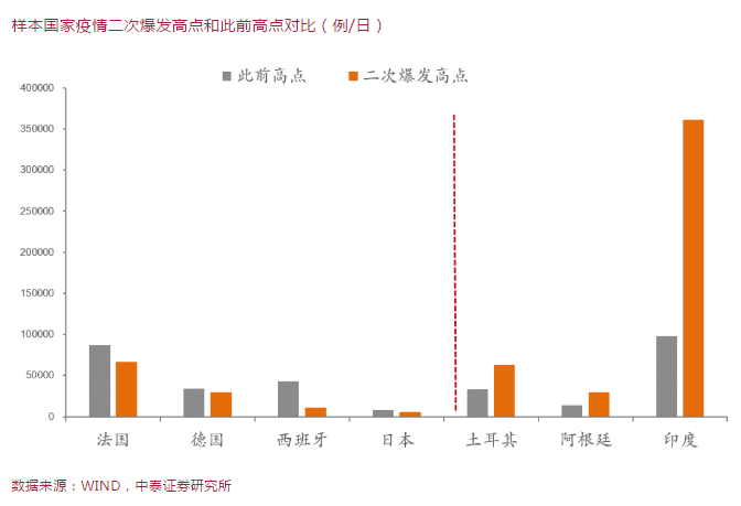 中泰策略分析师徐驰认为,本轮印度疫情具有:1)反季节性,当前印度疫情爆发在新德里气温已接近摄氏40度;2)以传播率、死亡率更高的变异病毒为主。这意味着,发展中国家一旦被扩散,医治及经济恢复的难度甚至比去年同期更大(去年原始病毒传播力在气温升高后下降的特点,至少留出了“夏季恢复”的“窗口期”)。