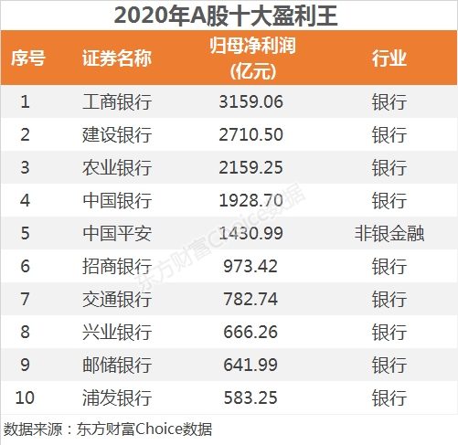 相较每年的十大“亏损王”常常换新,前十大盈利的公司则主要集中于银行板块。工商银行排名第一,2020年归母净利润为3159.06亿元,平均日赚8.65亿元。建设银行、农业银行、中国银行、中国平安等公司位列第二到第五位,归母净利润均超千亿元。