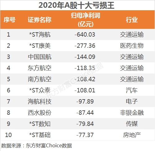 东方财富Choice数据显示,已披露2020年年报的公司中,归母净利润亏损的公司有600余家,盈利的公司有3680家。十大“亏损王”均亏损超70亿元以上。