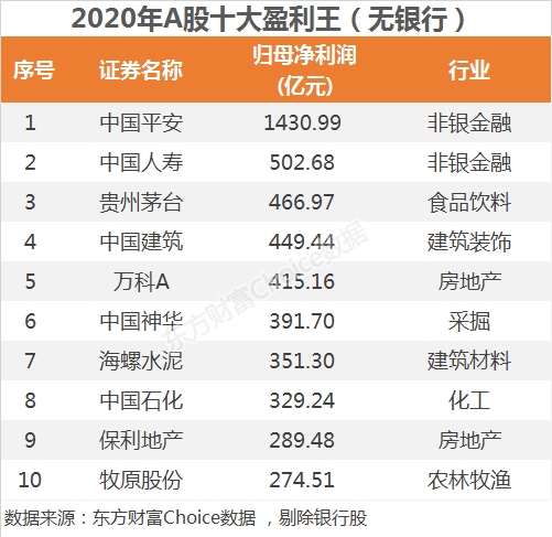 若剔除银行股,前十大盈利的公司中,中国平安、中国人寿居前二,贵州茅台归母净利润466.97亿元位居第三。中国建筑、万科A、中国神华、海螺水泥、中国石化、保利地产、牧原股份等个股冲进前十。