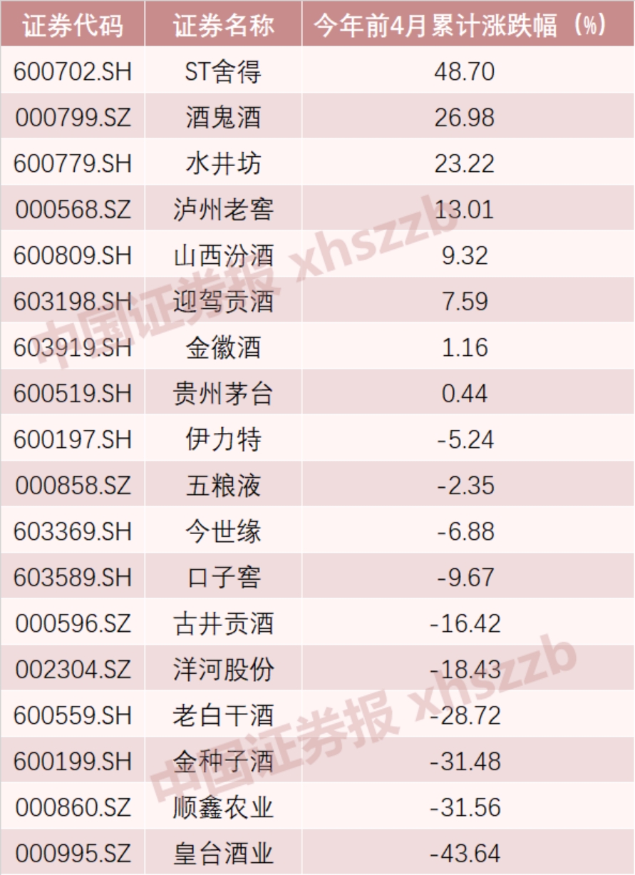 进入2021年,白酒股表现疲软,截至4月30日收盘,今年以来仅有8家累计涨跌幅为正,涨幅最高的是ST舍得,为48.7%,去年ST舍得累计涨幅已高达184.71%。