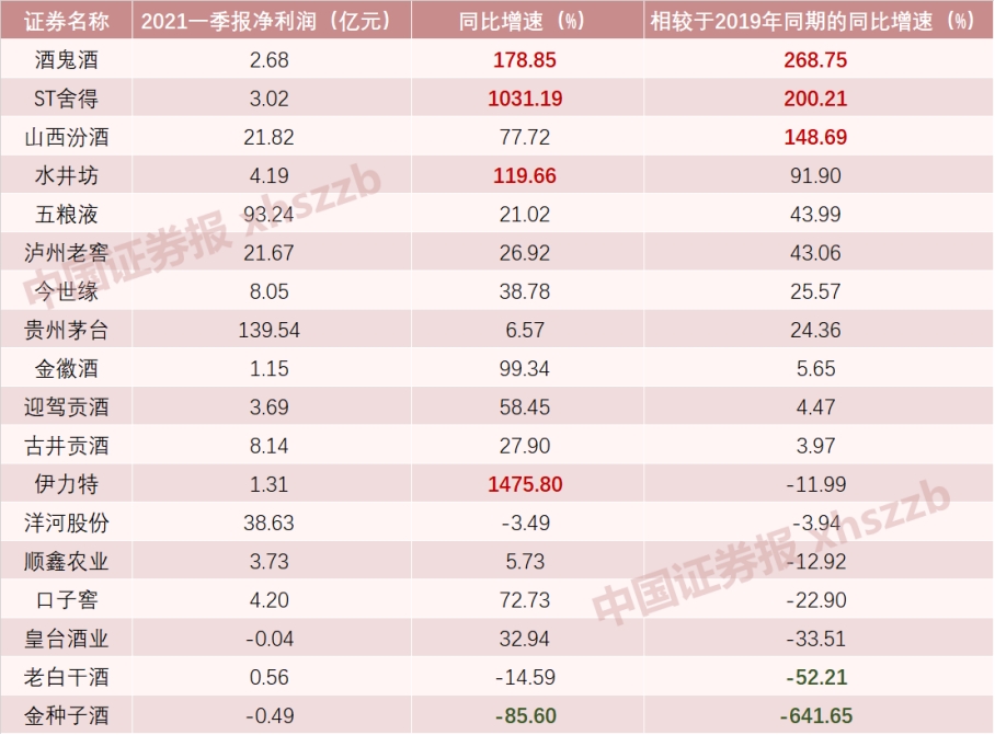但若是将2021年一季报数据与2019年同期相比,反弹则没有如此强劲,7家同比增速为负,但酒鬼酒、ST舍得、山西汾酒净利润增幅仍超100%。
