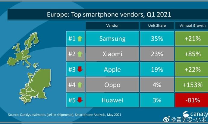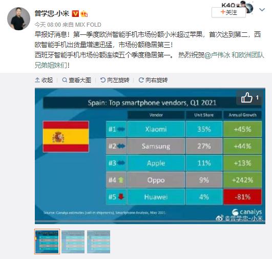 5月6日早上,小米集团副总裁、手机部总裁曾学忠发布微博表示,第一季度欧洲智能手机市场份额小米超过苹果,首次达到第二;西欧智能手机出货量增速迅猛,市场份额稳居第三;西班牙智能手机市场份额连续五个季度稳居第一。