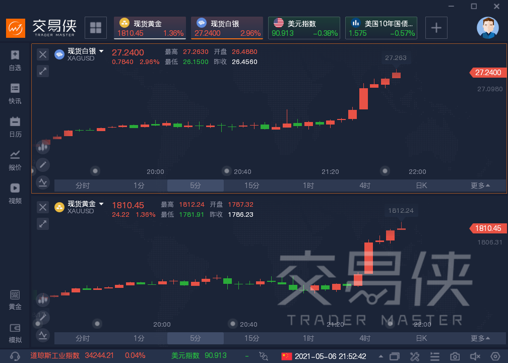 黄金的这波拉升或跟突如其来的多笔大单涌入有关。COMEX最活跃黄金期货合约北京时间5月6日21:35一分钟内买卖盘面瞬间成交5163手,交易合约总价值9.30亿美元;随后在21:39一分钟内买卖盘面又瞬间成交2075手,交易合约总价值3.75亿美元;21:47一分钟内买卖盘面又成交2100手,交易合约总价值3.80亿美元。