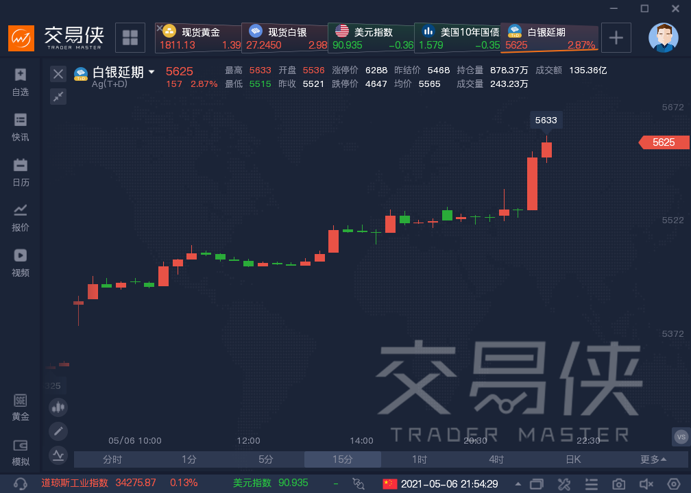 内盘也在涨,白银T+D日内涨3.02%,现报5633元/千克。