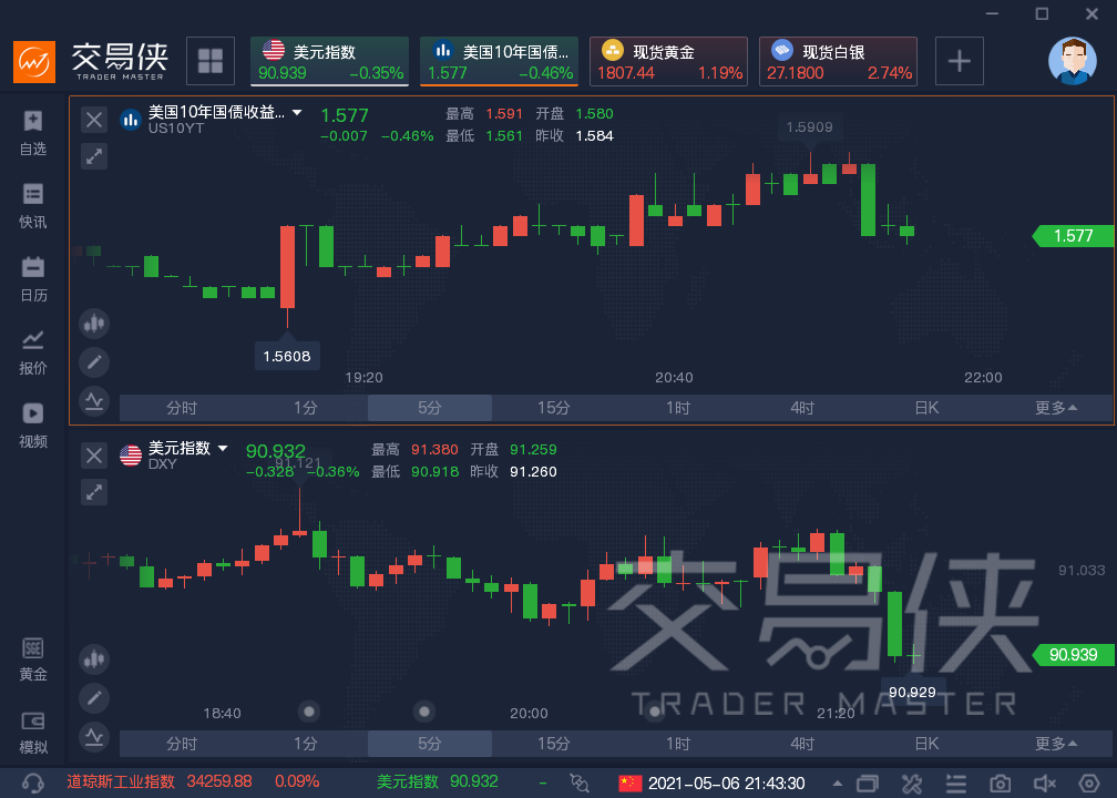 在现货金银上涨的同时,美元指数短线下挫10点,跌至91关口下方;美国10年期国债收益率小幅下挫,现报1.57%。