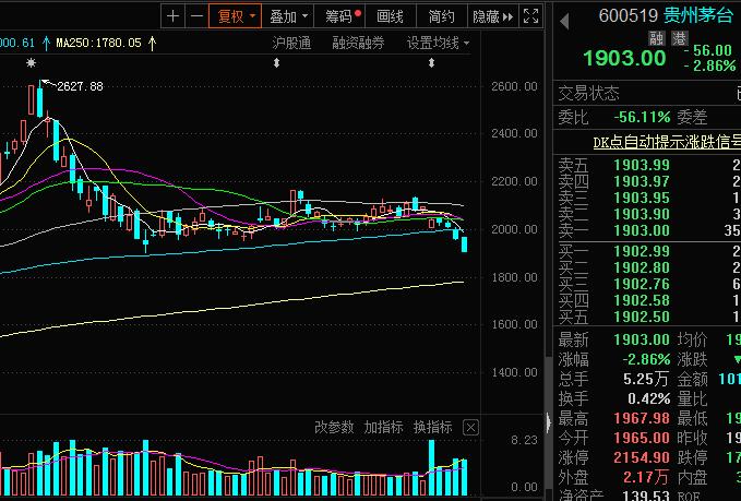盘面上,权重板块个股表现不佳,拖累指数,目前仍没有企稳止跌的迹象。以贵州茅台为例。茅台自2月份的高位2627元已经下跌了接近30%,目前价位接近1900元。近7个交易日茅台有6个交易日下跌,在持续向下的作用之下,权重板块个股也拖累指数下滑。