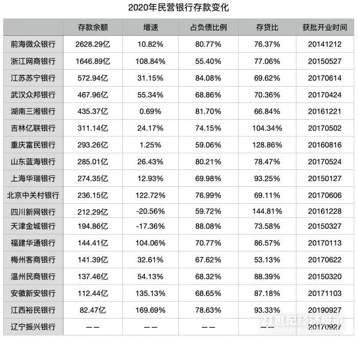 21世纪经济报道记者梳理已经发布财报的17家民营银行(一家未发布,一家开业时间较短)数据发现,2020年银行存款增长出现了较大的分化:一是17家银行存款增速分化;二是同批次开业的银行之间差距拉大;三是互联网类型银行、非互联网类型银行之间的差距也在拉大。