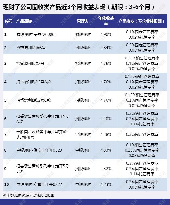 从理财子公司期限3-6个月的固收类产品近3个月收益表现来看,徽银理财“安盈”200065近3个月年化收益率最高,达4.9%。招银理财“招睿增利”系列多款产品进入排行榜前十。以“招睿增利B款2号”为例,其业绩比较基准为年化4%,截至5月6日,招睿增利B款2号C款最新净值为1.0048。据其产品说明书显示,收取固定投资管理费率0.10%/年,销售服务费率0.25%/年,托管费率0.03%/年。3月26日,招银理财发布费率优惠的公告,下调销售服务费率为0.15%/年,托管费率0.02%/年。