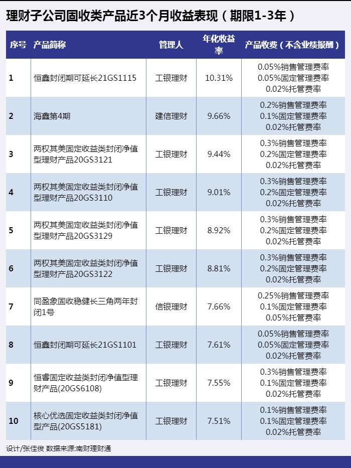 从投资周期1-3年的理财子公司固收类产品近3个月收益表现来看,工银理财“两权其美”固定收益类封闭净值型理财产品系列有多款产品上榜。