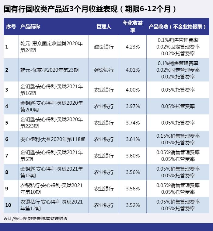 从国有行期限6-12个月的固定收益类产品近3个月年化收益率来看,上榜产品多为建行、农行发行,主要为建行“乾元”系列和农行“安心得利”系列。
