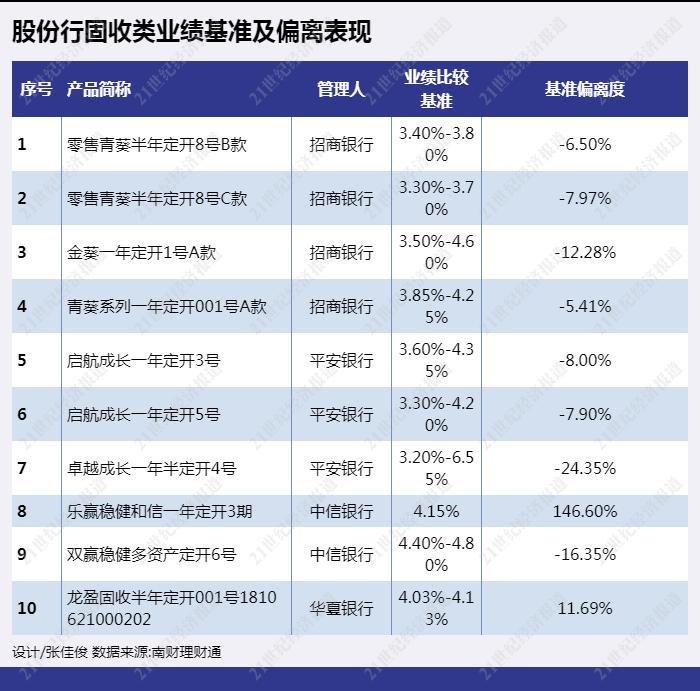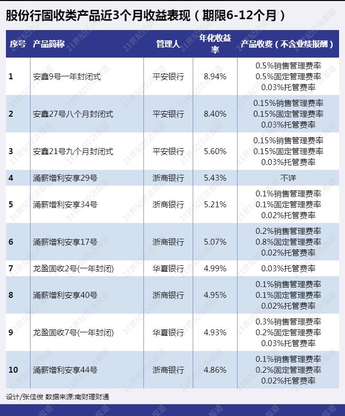 从股份行期限6-12个月的固定收益类产品近3个月年化收益率来看,平安银行、浙商银行、华夏银行有多支产品上榜。平安银行“安鑫9号”年化收益率8.94%排名第一,该产品为结构性理财,挂钩中证500,以固收打底分散投资风险。该产品成立后第三个月开始进行月度观察,只要观察到中证500较期初不下跌或跌幅<3%,期权即敲出,产品提前结束,业绩比较基准为年化5.2%;若10次观察日中证500较期初跌幅大于等于3%,则产品正常到期,业绩比较基准为年化0.3%。