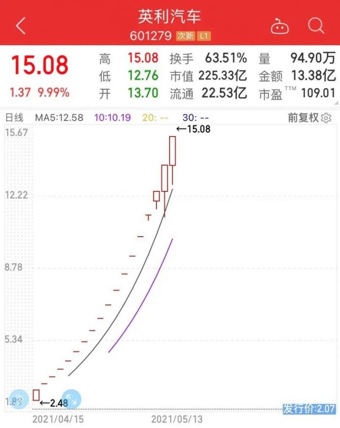 上市至今的18个交易日,英利汽连续涨停,市值突破220亿元。7次涨幅异动、数次风险提示,仍挡不住英利汽车股价上涨的势头。