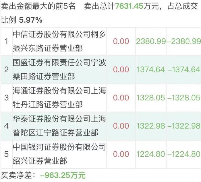 卖出席位中,银河证券绍兴营业部卖出1224.8万元。前一个交易日,该营业部刚刚买入1239.38万元。