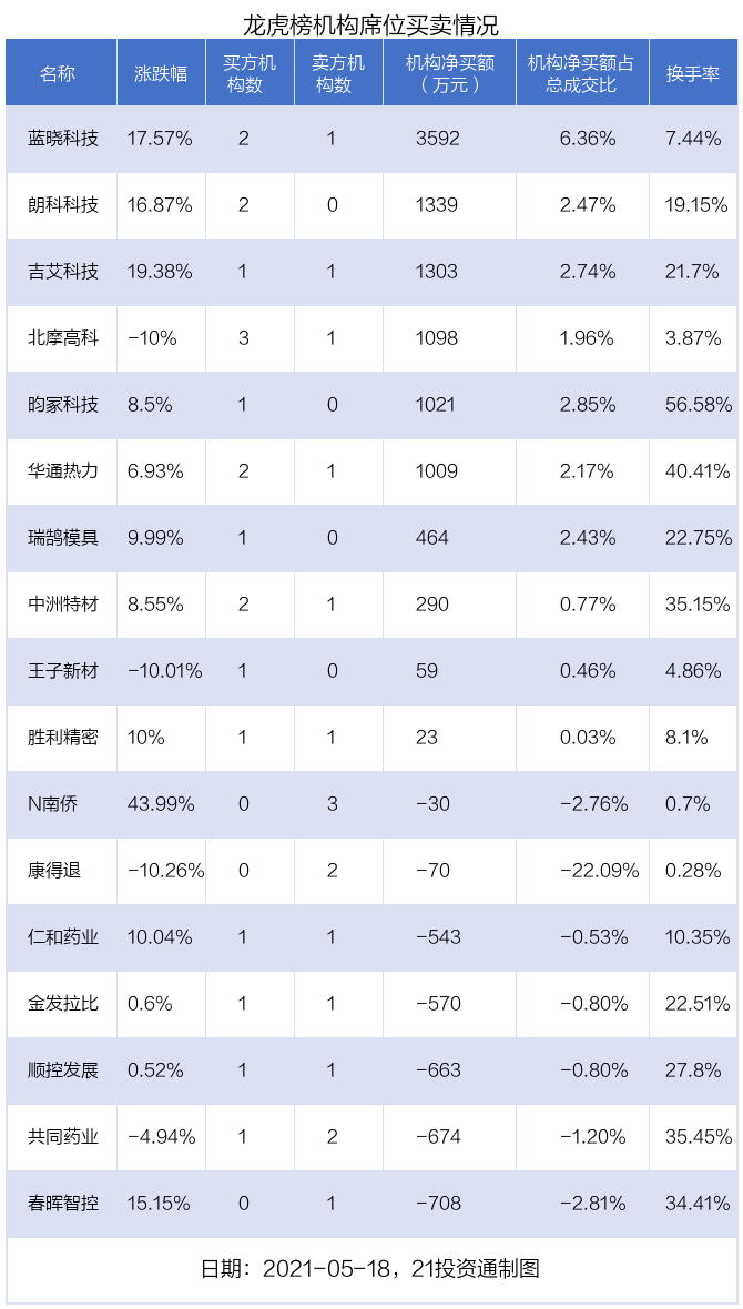 5月18日,17只个股龙虎榜出现了机构的身影,机构合计净买入6941.72万元。具体来看,机构净买入10股,净卖出7股。