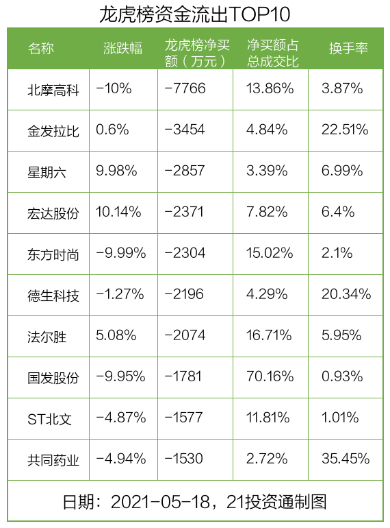 而龙虎榜中资金净流出最多的是北摩高科(002985.SZ),被净卖出为0.78亿元,占总成交金额的13.86%。北摩高科收盘下跌10%,换手率为3.87%。