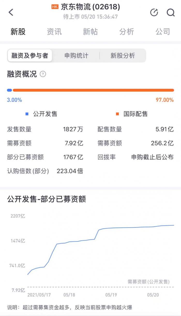 截至5月20日下午3时33分,京东物流完成超额认购达223.04倍,孖展金额达到1767亿港元。