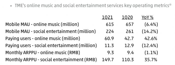 社交娱乐业务亦呈现此趋势。一季度,腾讯音乐社交娱乐服务MAU 2.24亿同比降低14.2%;社交娱乐付费用户1130万,同比下降11.3%,对应付费率5.5%。单用户付费方面,随着全民K歌的短视频商业化变现持续推进,一季度社交娱乐ARPPU 149.7元,同比增长35.7%。