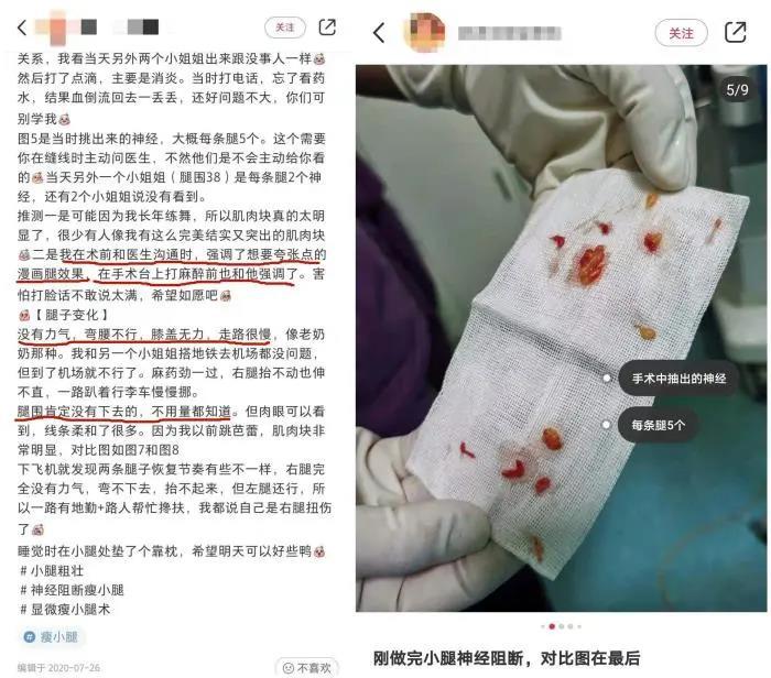 5月18日,一名女孩在网上分享了自己去医美机构切腿部神经的经历,配发了多张图片并称这种手术可以让一部分肌肉慢慢萎缩,从而达到“永久瘦小腿”的效果。
