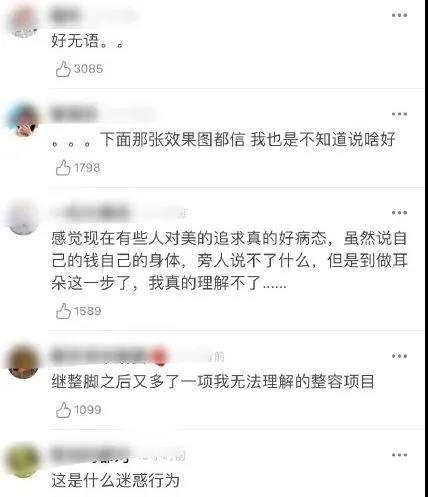 而就在今天(21日),另一项令人难以理解的整容项目也冲上了热搜第一。一名叫陈佳楠的网红在微博表示自己做了“精灵耳”。所谓精灵耳,其实就是我们日常所说的招风耳,据说耳朵大一些会显得脸型要小很多,很多网红为了显脸小,特意去整成招风耳。