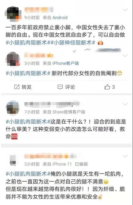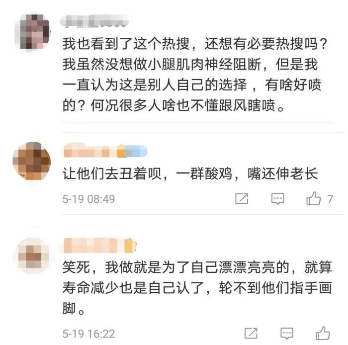 很快,“小腿肌肉阻断术”相关话题就冲上热搜。在评论区,一些人讲述了因为是肌肉腿、小象腿给自己带来的压力,比如被人嘲笑、不敢穿裙子或泳衣等,表示能理解“为了美这么拼”;也有人认为这是要美不要命,是一种自残行为,“现在好看一时,将来会坐轮椅”;更有人认为这是在贩卖焦虑,推行畸形审美,“难道腿不好看,就是我有错吗?”