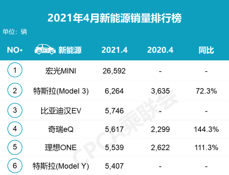 而在另一方面,按单款车型销量来看,4月,宏光MINI的销量为26592,是Model 3的4.2倍,比亚迪汉也销售了5746辆,已经非常逼近Model 3,超过了Model Y,理想ONE销售5539辆,超过Model Y。