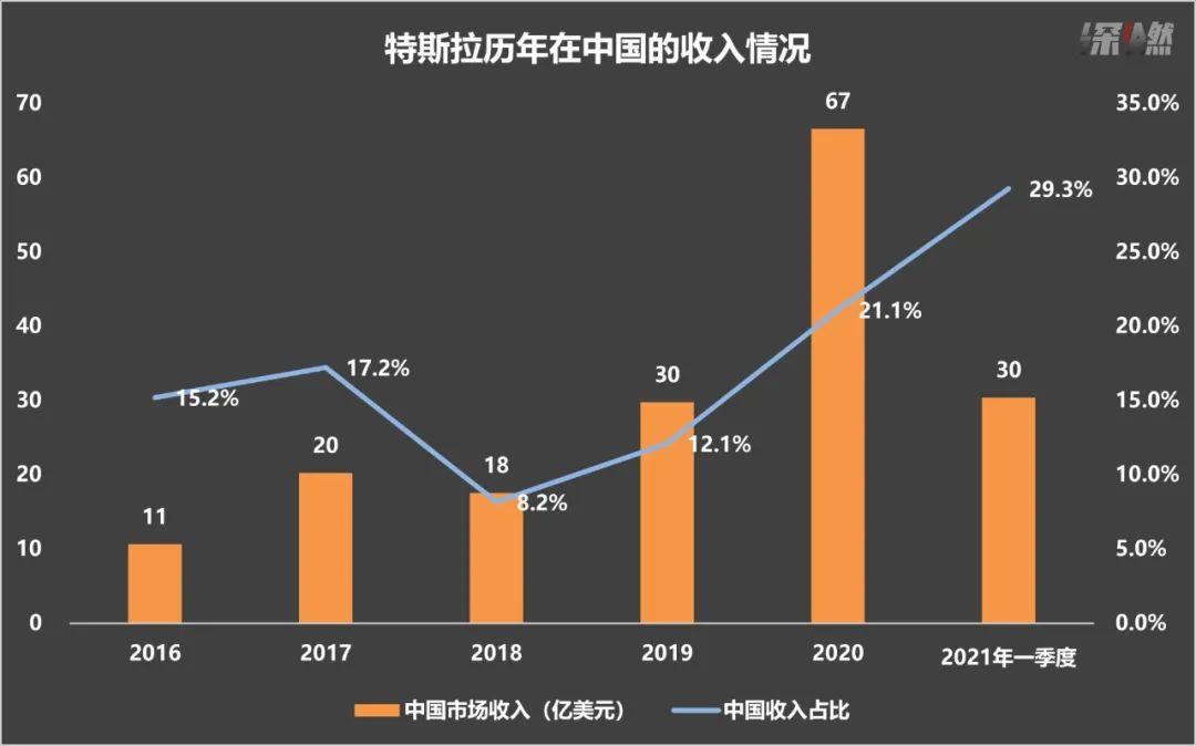 早在2016年,特斯拉一年的总收入是70亿美元,中国就贡献了11亿美元,当时美国市场的收入也只有42亿美元。过去几年,特斯拉在中国的收入随着销量的增加而水涨船高。2020年,特斯拉在中国赚走了67亿美元,在全球收入中的比重提升至21%,而美国市场的收入占比降至不足50%。在今年刚过去的一季度,中国市场已经为特斯拉贡献了30亿美元收入,占到全球收入的29%。