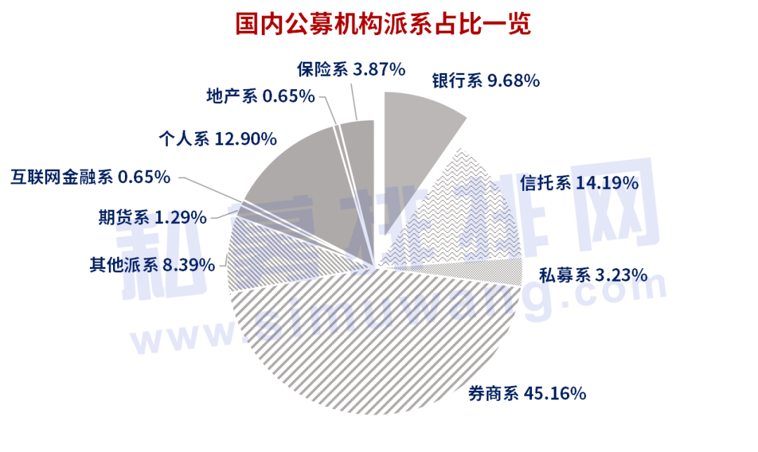 公募基金的管理规模和人员规模相对庞大,机构的属性通常强于基金经理个人的属性,所以公募基金以机构为单位、按照实控人的性质进行派系划分,主要分为银行系、信托系、私募系、券商系、个人系、保险系、地产系、期货系、互联网金融系等众多的派系。