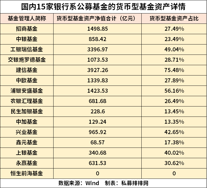 值得注意的是,建信基金、工银瑞信基金的基金资产中,货币市场型基金的规模都比较庞大,均在3000亿以上。它们也是银行系公募中管理货币基金规模最大的两家,堪称“货币基金大户”。其中,建信基金的基金资产净值中,货币基金资产的占比更是高达75.48%,在银行系公募中名列第一。
