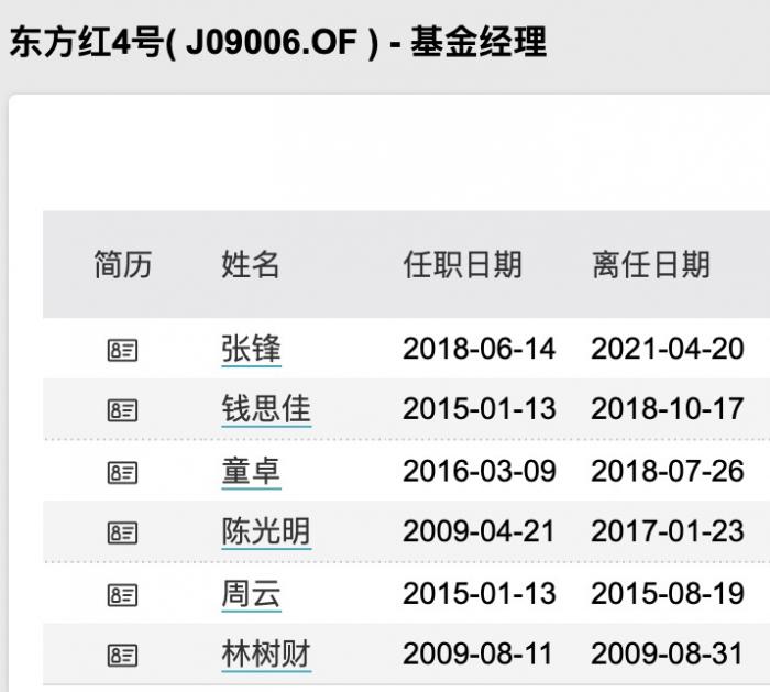 东方红4号有过6任基金经理,包括大名鼎鼎的陈光明,现任基金经理张锋于2018年6月开始接手东方红4号,他自1999年进入证券行业,从事投研工作,具有22年证券从业经验,13年投资管理经验,目前担任东方红资产管理副总经理、首席投资官、投资决策委员会主席。
