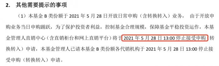 当天,东证资管紧急发布《关于东方红启恒三年持有期混合型证券投资基金B类份额暂停申购(含转换转入) 业务的公告 》,公告称,东方红启恒三年持有混合基金B类份额于5月28日开放日常申购(含转换转入)业务, 由于开放申购业务当日申购踊跃,为了保护投资者利益,控制基金合理规模,保障基金平稳投资运作,基金管理人直销中心(含直销柜台和网上直销平台)将于2021年5月28日13:00停止接受申购(转换转入)申请,已请改基金B类份额各代销机构于5月28日13:00停止接受申购(转换转入)申请。