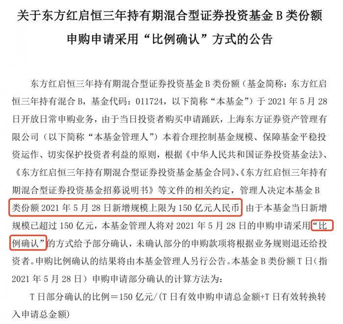 随后,东证资管又发布《关于东方红启恒三年持有期混合型证券投资基金B 类份额申购申请采用“比例确认”方式的公告》,公告称,管理人决定对东方红启恒B类份额2021年5月28日新增规模上限为150亿元人民币,由于当日新增规模已超过150亿元,基金管理人将对2021年5月28日的申购申请采用“比例确认”的方式给予部分确认,未确认部分的申购款项将根据业务规则退还给投资者。