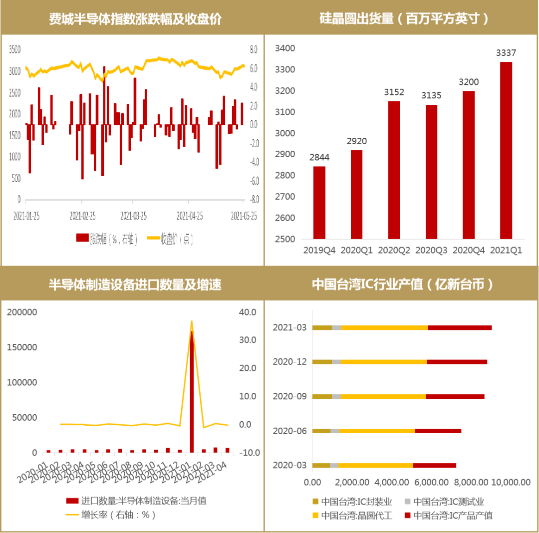 晶圆出货量创新高:2021Q1全球硅晶圆出货面积创历史新高,较2020年第四季增长4%,出货量同比上升14%,晶圆产能爆满、行业景气度高。