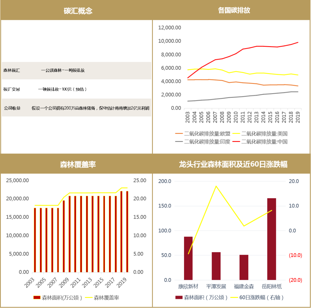 政策推动预期强烈:“十四五期间”生态建设基本目标确认,力争达到2025年全国森林覆盖率达到24.1%,森林储集量达到190亿万立方米。植树造林吸收二氧化碳。截止到2019年底中国森林覆盖率22.9%,中国碳排放还未达峰。