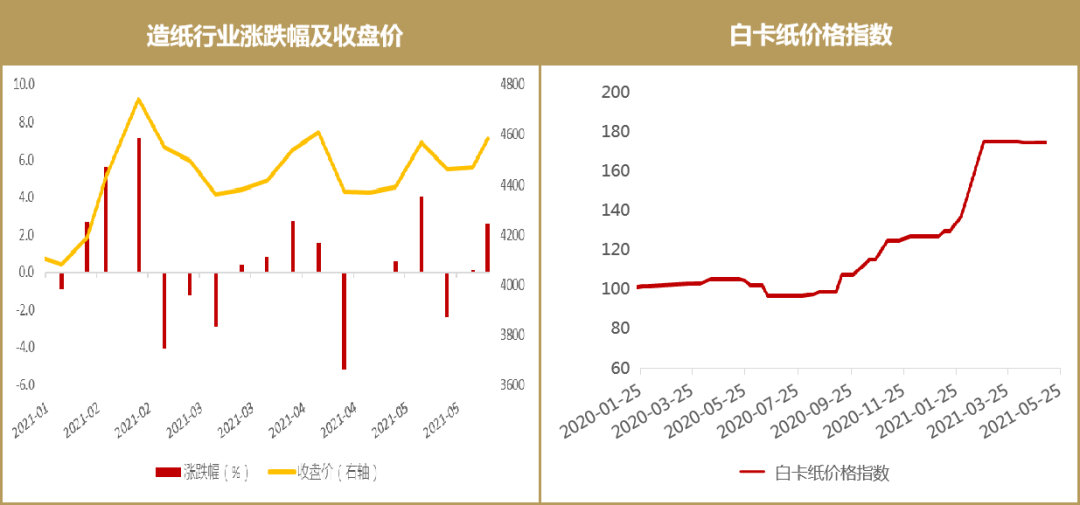 多家企业发布涨价函:五月份以来,国内主要文化纸企业和贸易商普遍涨价,文化纸涨约200元/吨,白卡纸涨约1000元/吨,除上游成本增加所致以外,白卡纸前期基数较低也是原因之一。