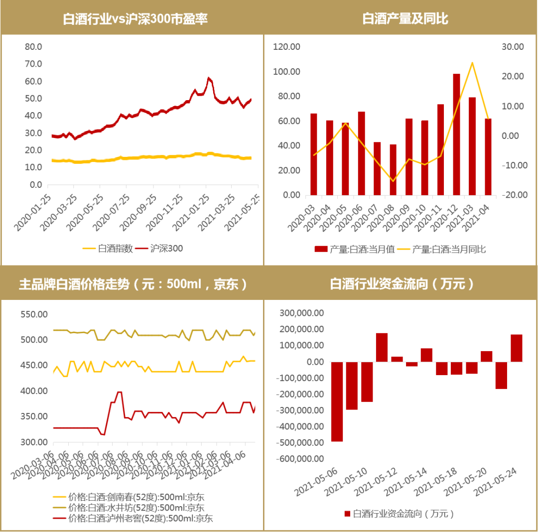 量:端午、618等消费场景的回补,补偿性需求上升,白酒行业进入控量挺价期。高端酒企积极提升生产能力:十三五”茅台酒技改项目全面完成投产,新增茅台酒基酒设计产能4,032吨;五粮液30万吨陶坛陈酿酒库一期8万吨竣工投产,将于年内完成重点车间(506)改造;泸州老窖采用科技发展促进智能酿造,提高自动化运营能力,当前产能170000吨;预计龙头企稳,二线品种有望补涨。