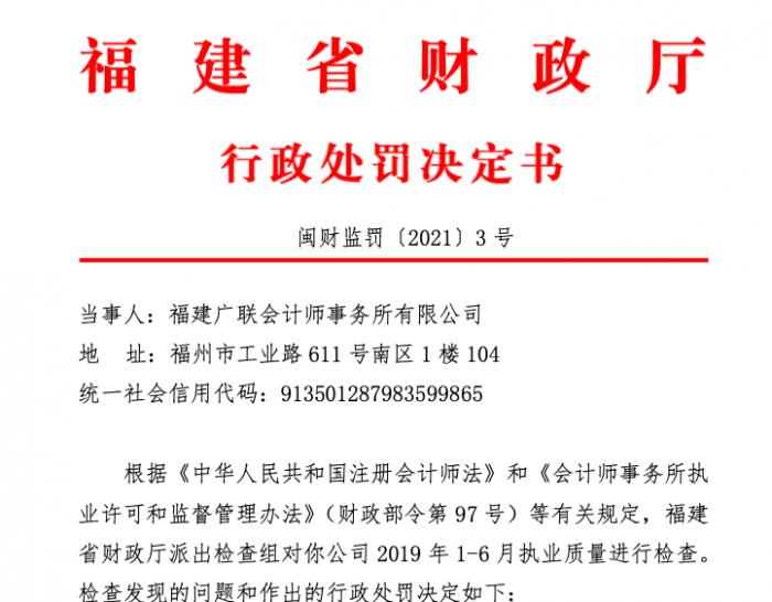 鉴于福建广联会计师事务所的上述行为违反了《会计师事务所执业许可和监督管理办法》(财政部令第97号)第六十条第一、五、七项的规定。福建省财政厅给予该会计师事务所暂停执业6个月的行政处罚。