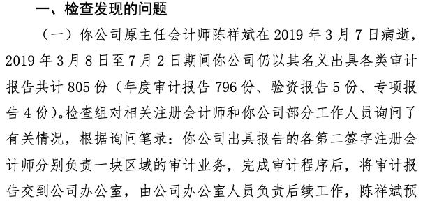 近日,监管部门的一份处罚决定也透露了部分会计师事务所在工作中的不负责任以及风控的缺失。比如,这家名为福建广联会计师事务所的机构,检查组发现,在该会计师事务所主任会计师陈某去世后的半年内,这家会计师事务所仍以他的名义出具了各类审计报告共计805份。