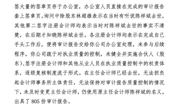 福建省财政厅认为,福建广联会计师事务所疏于对执业质量的控制,未健全并实施合伙人(股 东)、签字注册会计师和其他从业人员在执业质量控制中的权责体系,逐级复核制度流于形式。在主任会计师已经去世,无法担负起会计师事务所主体责任,无法保持对审计报告质量控制的情况下,未及时变更主任会计师,仍使用原主任会计师陈祥斌的名义,出具了805份审计报告。