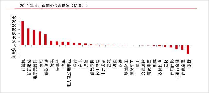 从整个四月的操作上来看,南向资金的风险偏好明显提升。具有科技属性的“新经济公司”依然是最爱,计算机、电子元器件、医药等板块的资金净流入排名靠前。除此之外,受到新疆棉花事件的影响,国产服装品牌也获得了资金的支持。