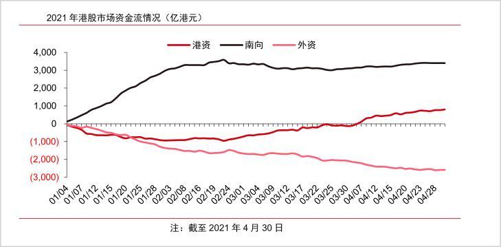目前港交所市场主要有三类资金:港资、外资和南向资金。中信证券最新研究报告显示,2021年以来,外资呈现持续净流出态势,前四个月已经累计流出了超2580亿港元,而这些筹码大多被南向资金和港资接走。