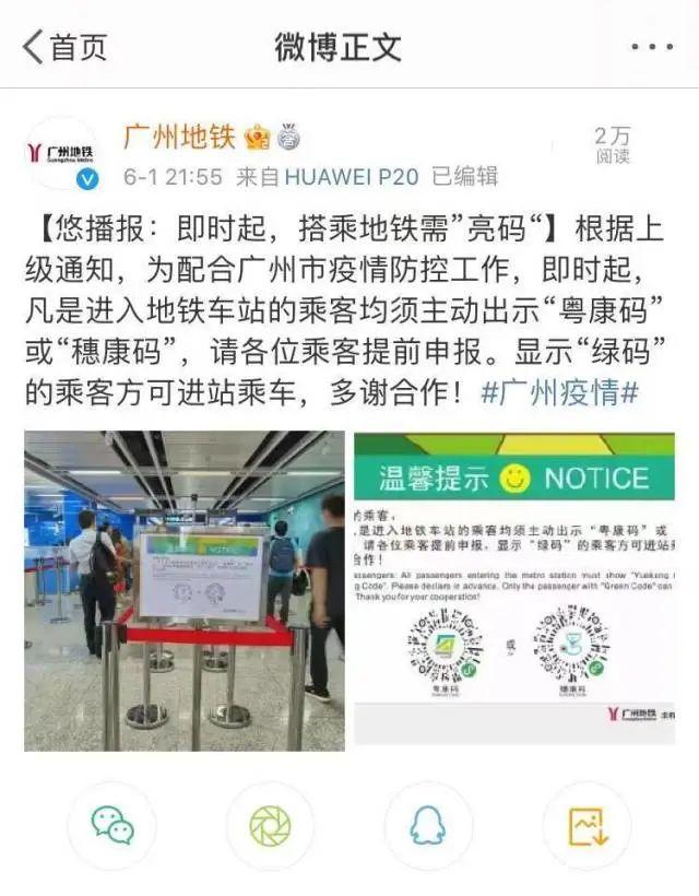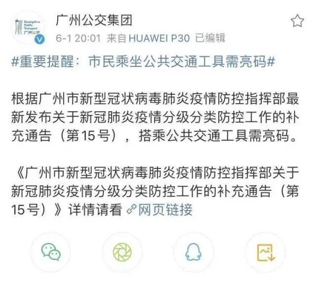6月1日,广州发布广州市新型冠状病毒肺炎疫情防控指挥部关于新冠肺炎疫情分级分类防控工作的补充通告(第15号)。通告明确,“搭乘公共交通工具,进入餐饮、娱乐场所、室内文化体育场馆、各类市场、商场等场所需亮码。”