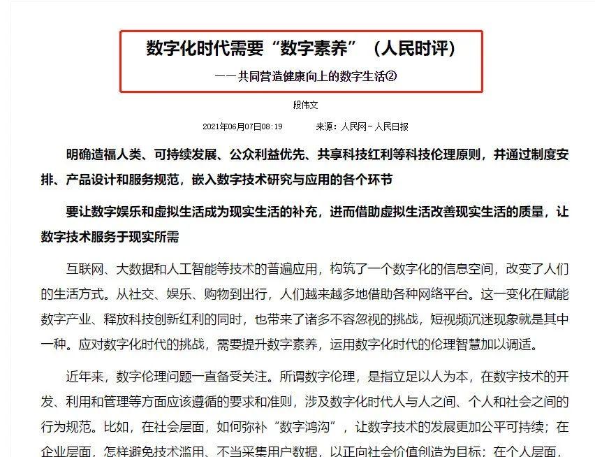 今天,《人民日报》发表的“人民时评”《数字化时代需要“数字素养”》中强调了对短视频沉迷现象的反思,同时呼吁对严重的侵权行为,相关部门应当加强监管。