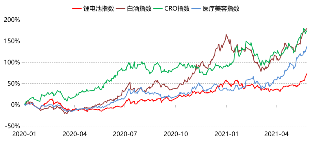接着是5月份CRO指数、白酒指数、锂电池指数等纷纷创出历史新高,今年以来累计涨幅分别达到45%、15%、16%,好于市场主流宽基指数表现。