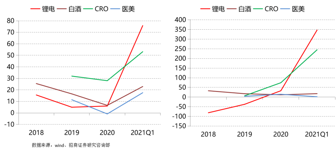 从行业的营业收入增速来看,尽管有去年低基数的影响,但锂电、CRO、白酒、医美今年一季度的营业收入同比增速分别达到76%、53%、23%、18%,净利润同比增速更是分别达到347%、245%、18%、2%。