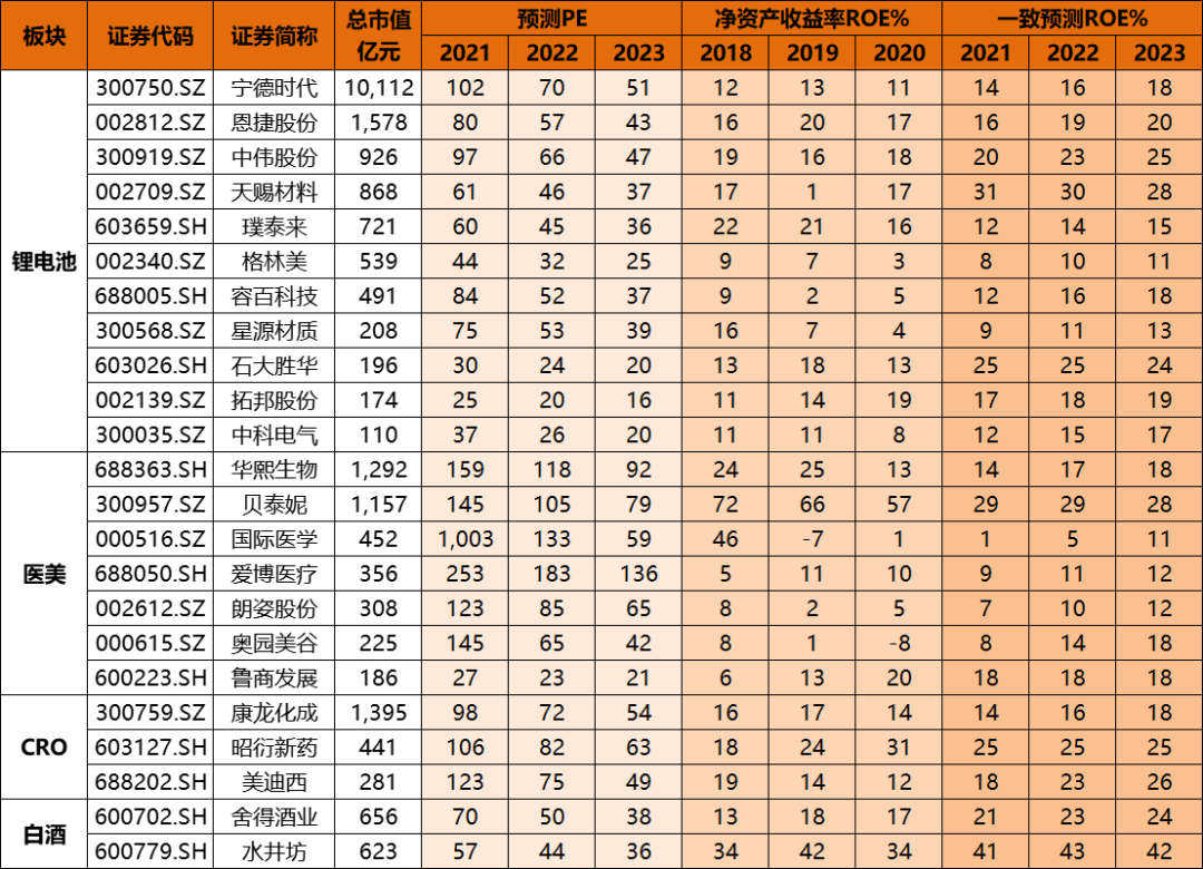 从个股未来三年的一致预期估值来看,锂电池、白酒、CRO板块的新高个股当前估值相对低一些,三年之后的估值通过业绩增长消化之后大多处于可接受的水平,部分标的以未来3年的角度来看,估值相对还是低一些。