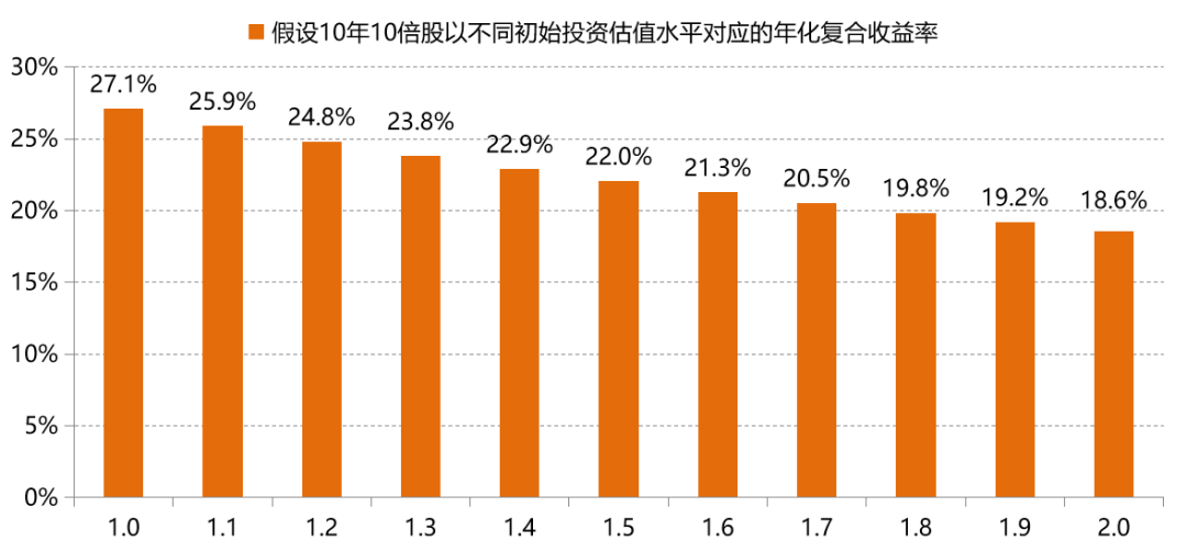 如果初始估值为1倍,那么投资10年的复合收益率为每年27.1%,10年10倍;