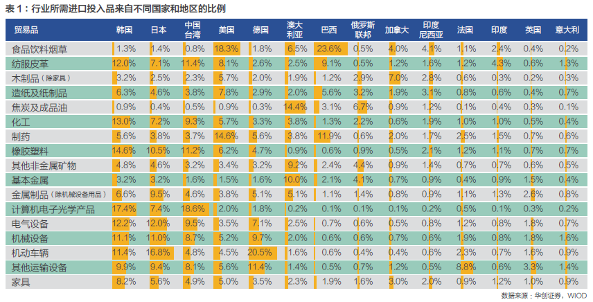 目前来看,中国参与全球产业链的方式,正在朝着简单产业链全产业链化结合部分下游低附加值环节转出,较复杂产业链趋向区域化,极复杂产业链仍然延续全球化的格局。在劳动密集型环节,中国的比较优势从2013 年前后开始明显下降,服装鞋靴箱包家具等行业的产业转移早在中美贸易摩擦之前就已经发生。在较复杂的ICT、化工、机械等领域,以中间品贸易来衡量,中国与东亚的主要经济体形成了紧密的分工关系(表1)。因此,东亚构成了中国产业链供给方的基本盘。此次RCEP 的重大意义就在于终于将事实上已经形成紧密产业关联的中日韩三国纳入其中。