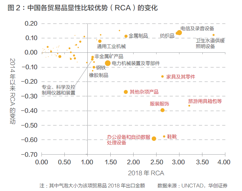 从在全球价值链所处的位置来看,过去的30 年中国的产业升级描绘出了一条完美的微笑曲线(图1)。1990 年-2001 年加入WTO 之前,中国以两头在外的方式融入全球产业链的劳动密集环节,分工位置快速向具有比较优势的下游走。加入WTO 带来了中国全球价值链参与度的快速提升,但分工位置并无明显变化,更多是融入全球产业链的广度和量级的变化。关键的变化发生在2008 年前后,此后中国产业链明显开始向更高阶的中上游攀爬。过去5年,中国的通用工业机械、纺织品等的显性比较优势均在上升(图2)。世界主要国家和地区的全球分工位置变迁也显示,过去10 年中,中国大陆、中国台湾、韩国、马来西亚是分工位置走向上游最为明显、产业升级最为确定的经济体。